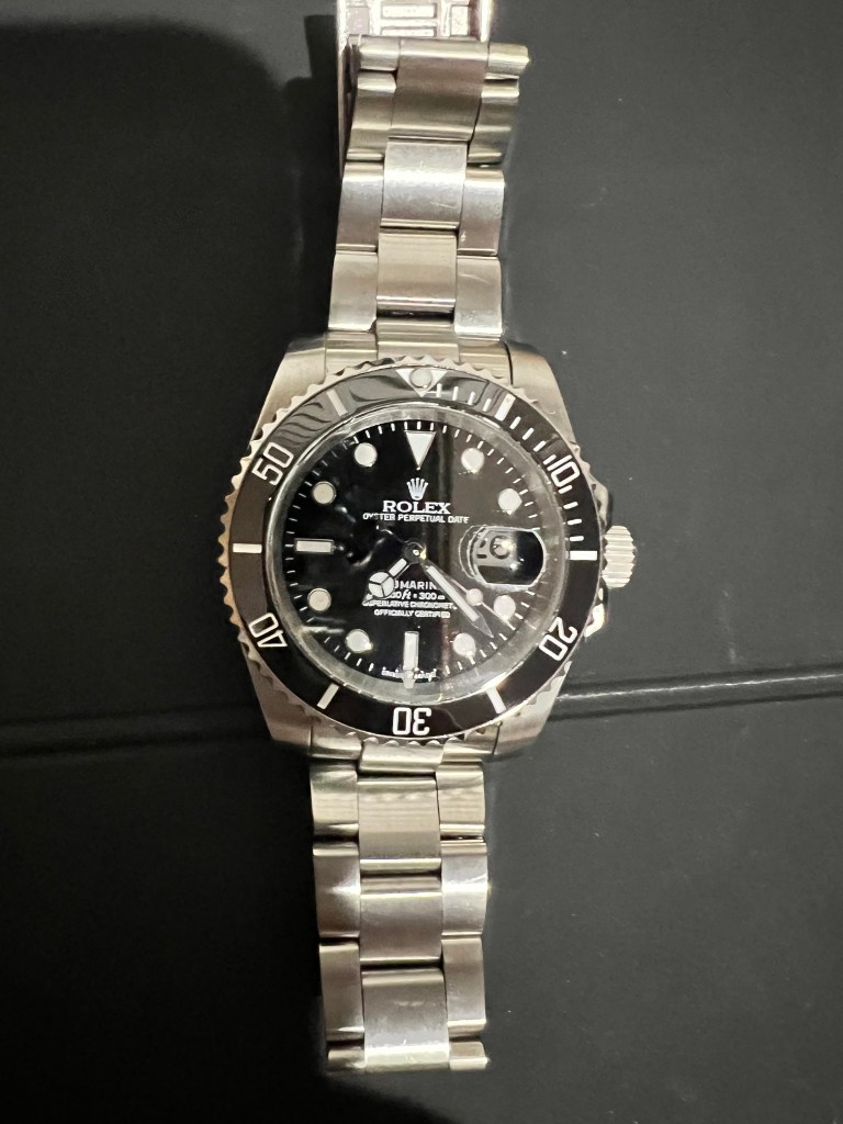 Fake Rolex bought from AliExpress for $83. Looks well and tells time (but loses a few min per week), but the second hand moves at non constant speed. B- grade.